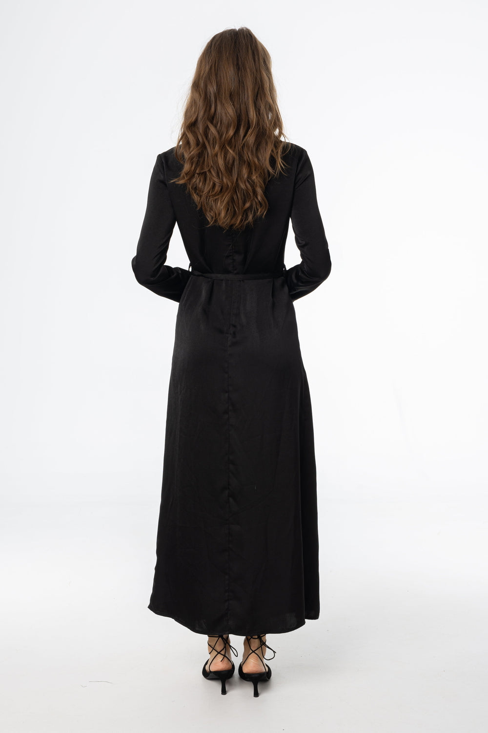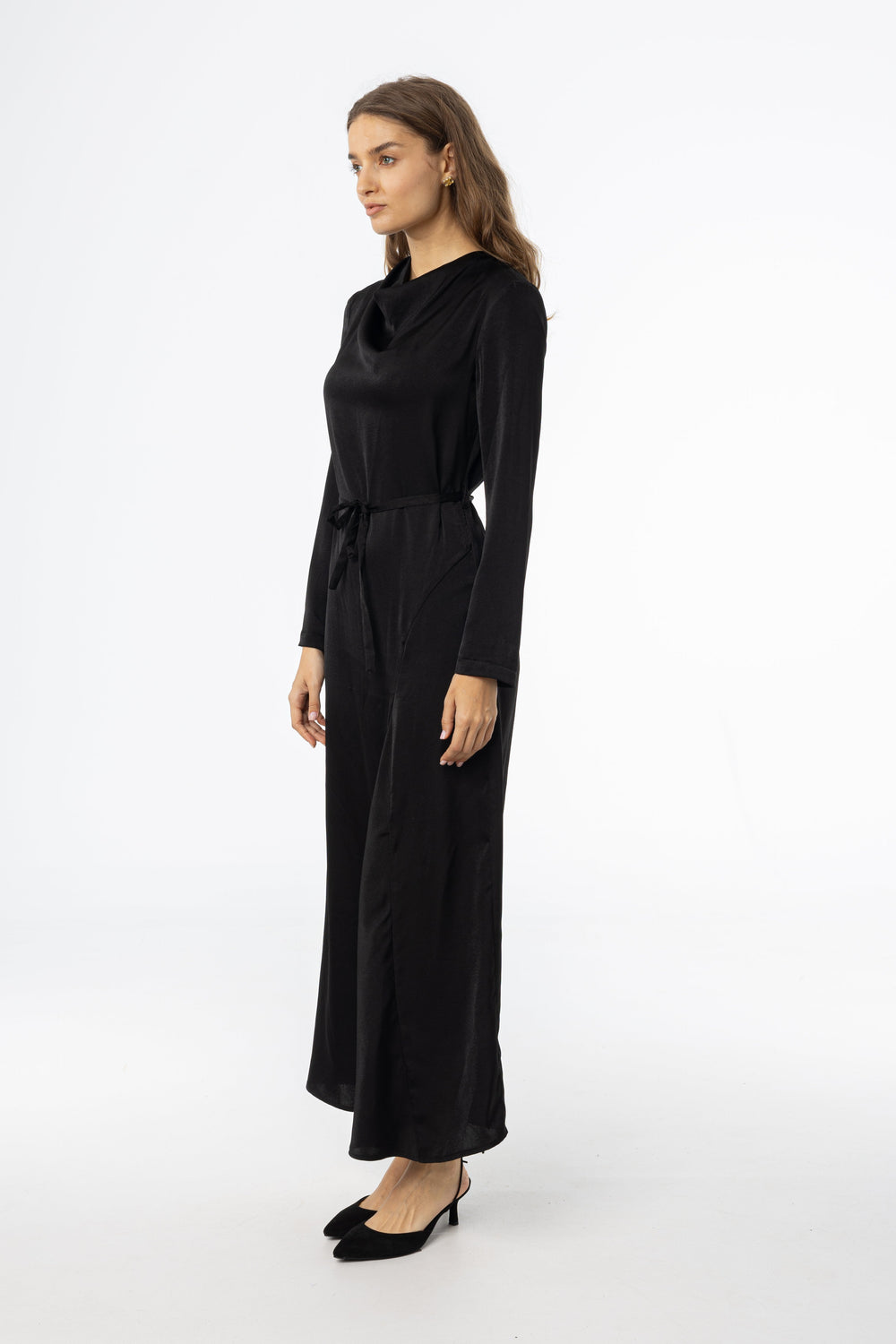 This is fall elegance without the drama. The draped neckline feels elevated, but the rest of the dress? Chill. Soft fabric, full-length coverage, and just enough structure to make it dinner-party ready without feeling stiff.