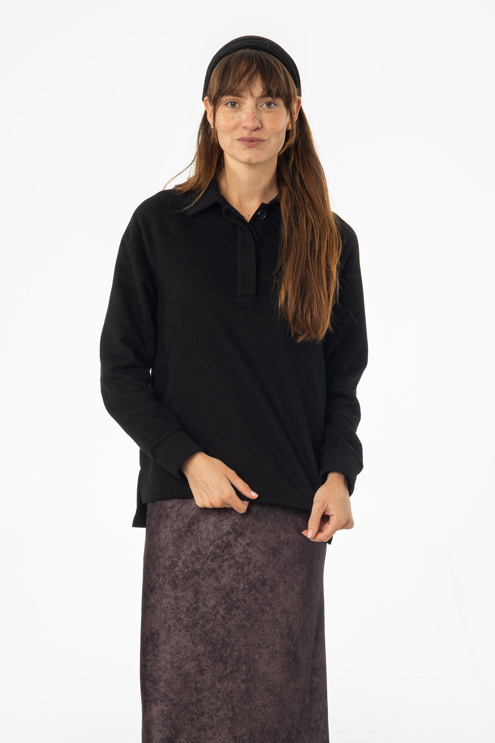 Merging the polish of a polo with the ease of a sweatshirt, this piece is perfect for in-between fall days. The collared neckline adds just enough structure to elevate casual looks. Style it with a denim skirt and ballet flats for a balance of sporty and refined. Or wear with layered necklaces to bring a feminine finish. It’s a versatile essential that keeps your wardrobe fresh.