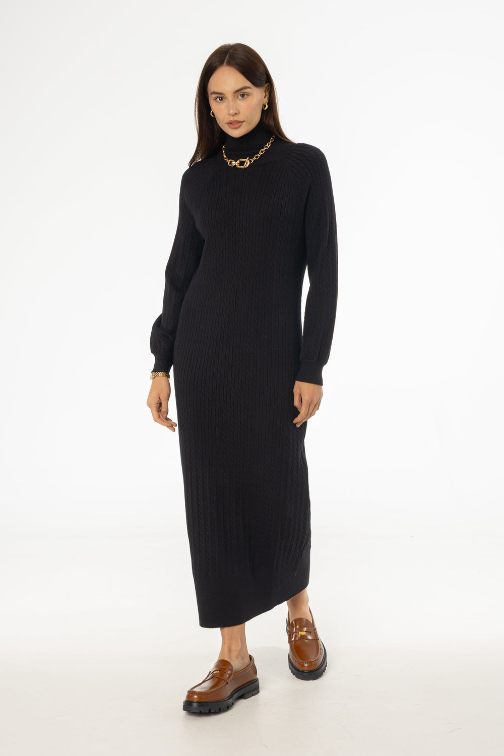 Cozy, textured, and full-length basically everything you want in a cold-weather dress. The cable knit adds depth while the turtleneck keeps it classic. Pair it with boots and a long coat when the air gets chilly. It’s equal parts comfort and style.