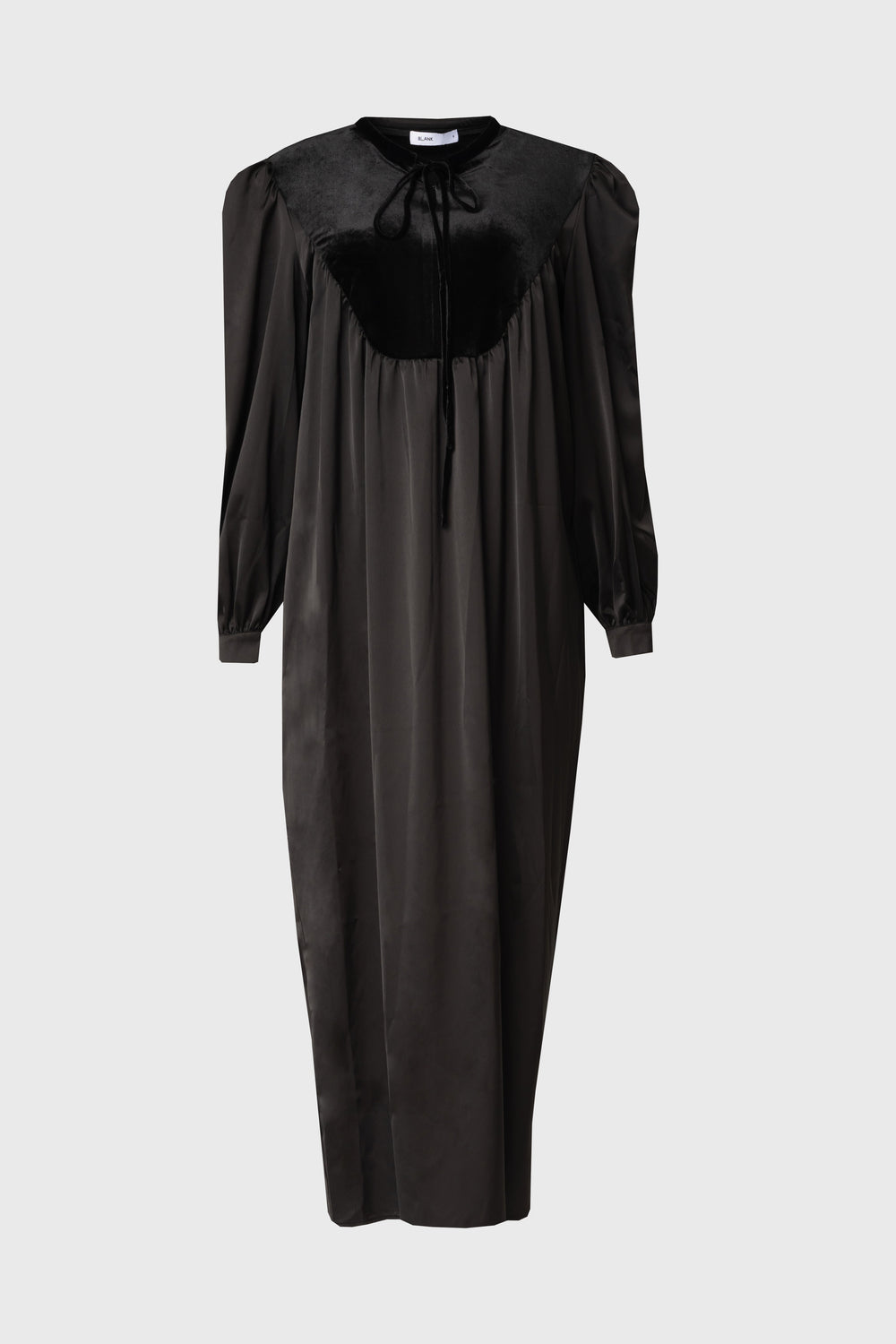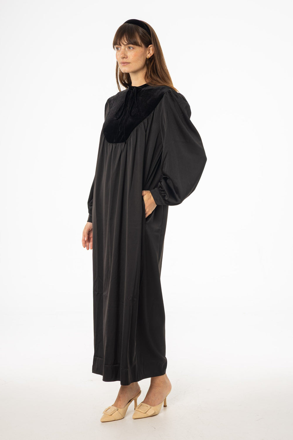 Velour gives this black maxi dress a soft, luminous finish that feels rich for fall evenings. The yoke detail frames the neckline beautifully, offering an understated elegance. Style it with drop earrings and sleek heels for a refined dinner look. For day-to-night dressing, layer on a tailored blazer and cinch at the waist. This dress is effortlessly poised for every autumn occasion.
