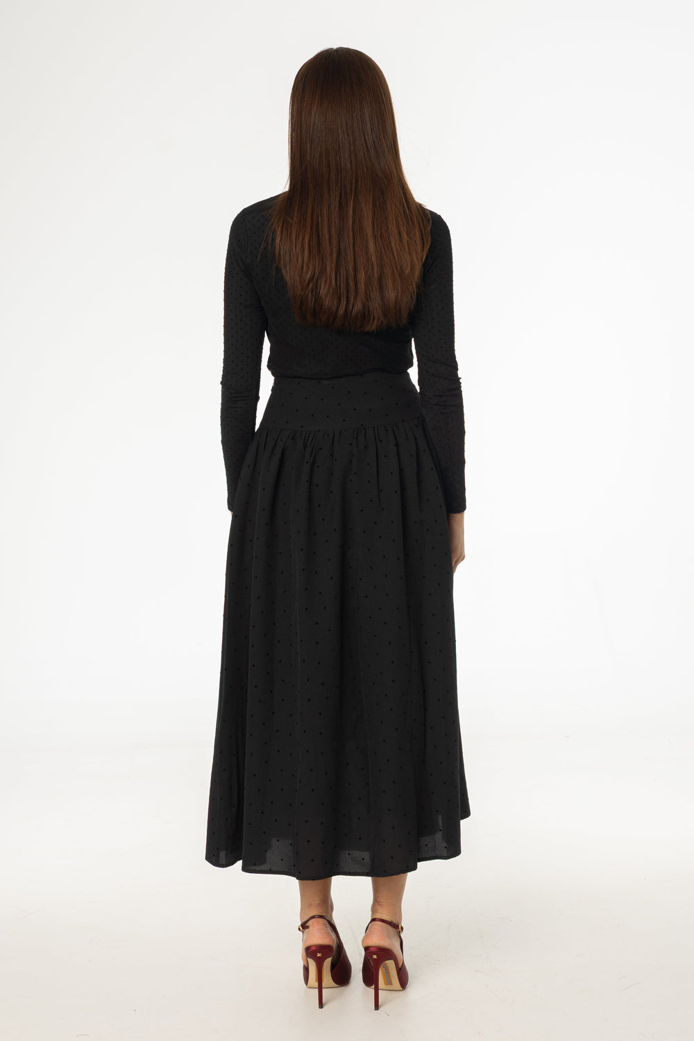 Velvet, but with a playful twist. The dot pattern gives it character, while the maxi length makes it feel elevated. Perfect for holiday dinners, but just as easy to tone down with a fitted top. A skirt that can do festive and everyday with ease.